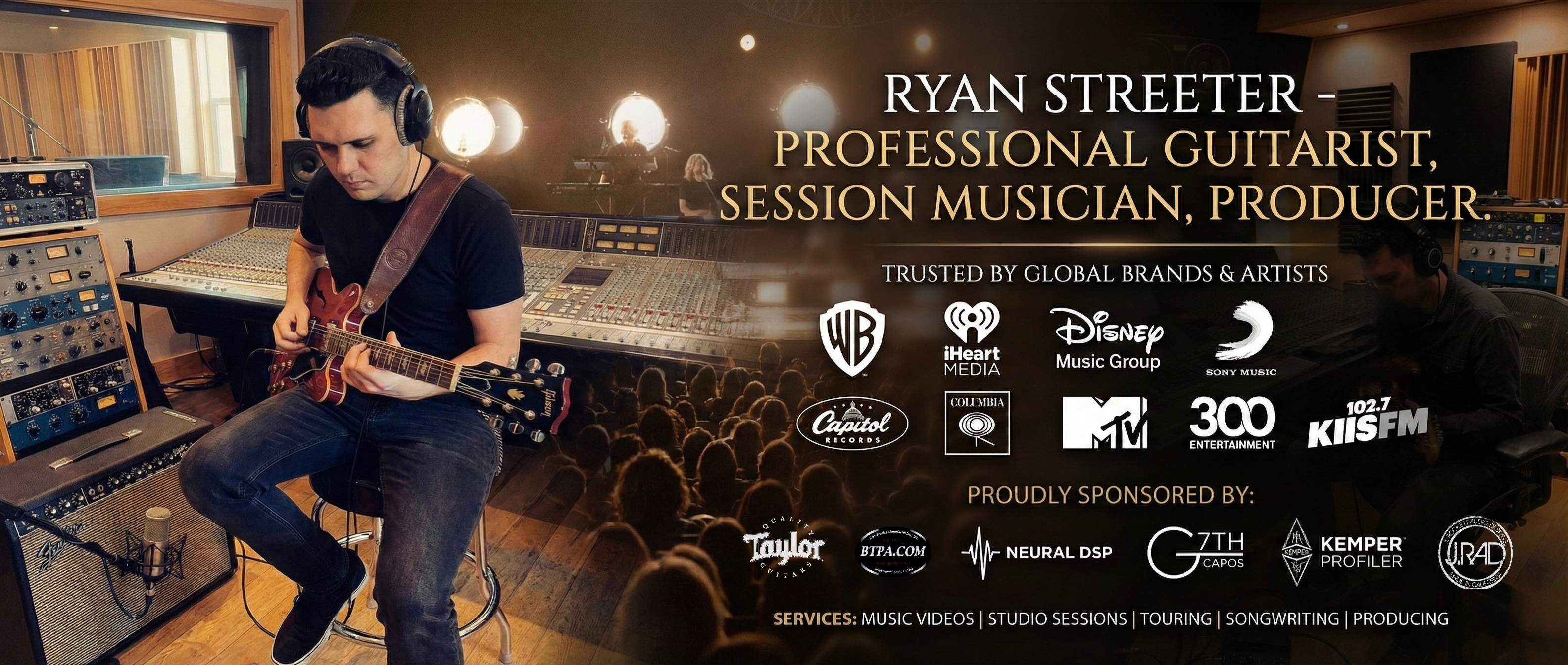 Ryan Streeter is a Professional Music Director / Guitarist / Producer / Playback Tech based in Orange County/Los Angeles. He graduated from the Musicians Institute (Guitar Program & Independent Artist Program). Ryan has been the Music Director / Guitarist / Playback Tech for multiple Major Label Artists, Social Media Influencers and Independent Artists. Also, he has become a “one stop shop” Session Musician being able to Record/Produce Professional Quality Tracks (Guitar, Bass, Drums, Synth, etc.) using his extensive catalogue of high-end gear and has created Sound FX for numerous Musicals and Shows. Ryan’s work has resulted in over 30+ Million Views on YouTube and Millions of listens on Spotify.